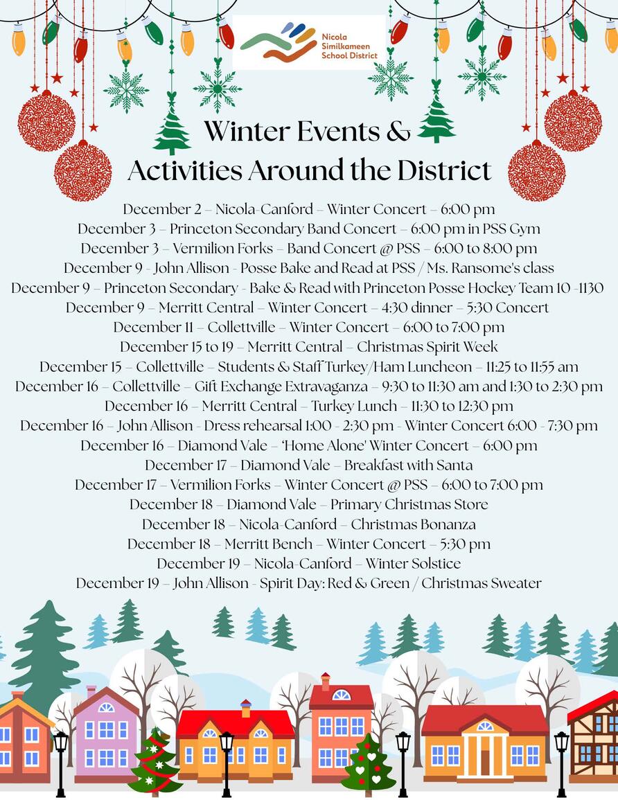 Breadcrumb Home News Stories news Winter Concerts & Events Around the District November 28, 2025 Announcements Allery Aware: Nut-Free/Scent-Free! News Stories November Updates 2025 November Blog Winter Concerts & Events Around the District Our Calendar PAC Meeting Jan 13 School Spirit Day- Dress Up Like Future Self Jan 28 Winter Celebration @ Merritt Civic Centre Jan 29